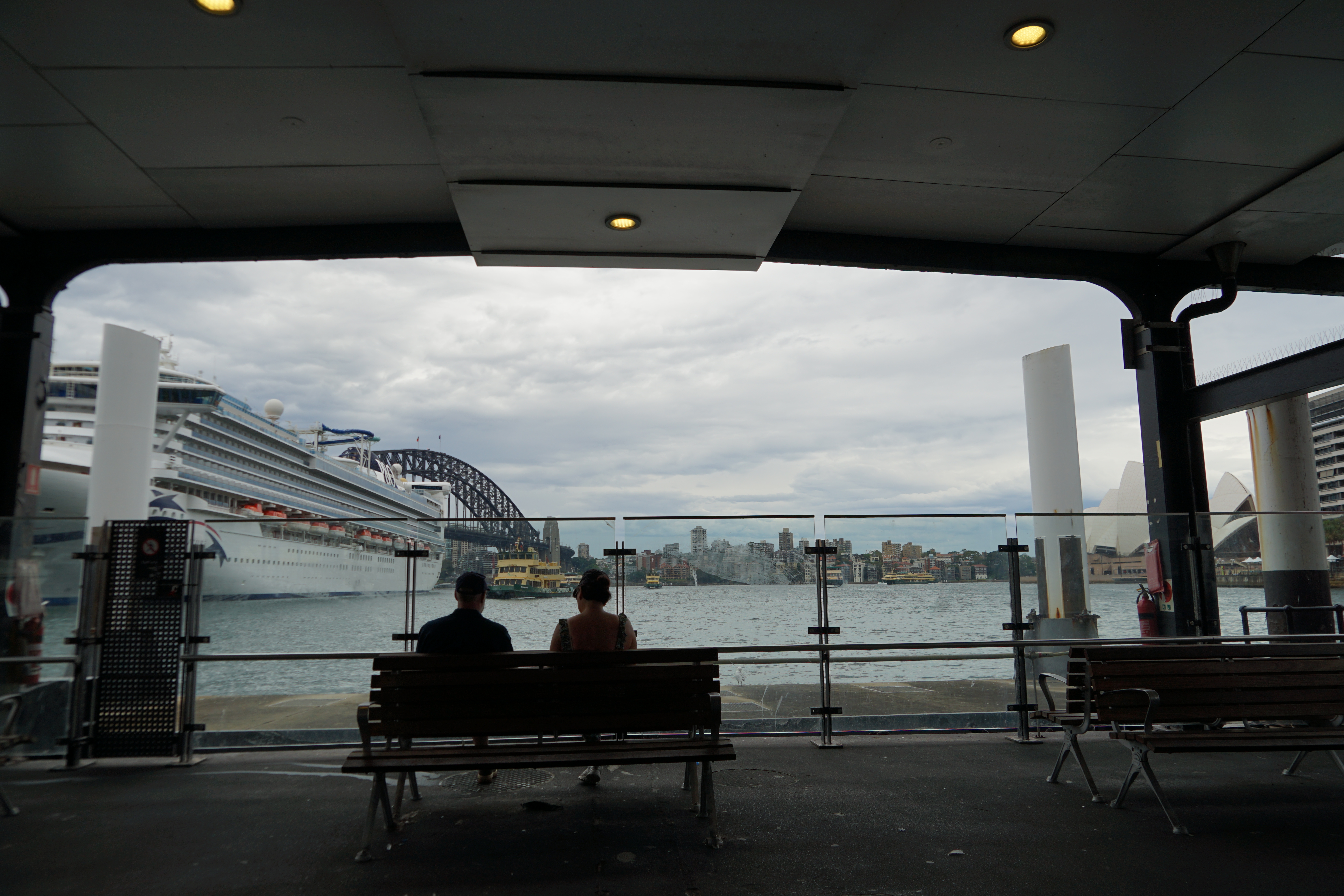 서큘러키 대합실에서 초대형 유람선과 하버브리지를 보면서 배편을 기다림.